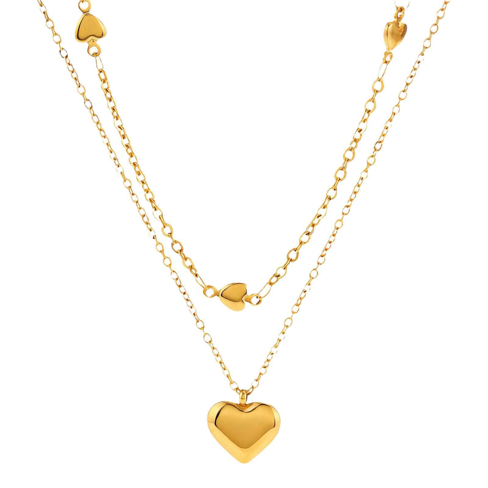 Ett stilrent och trendigt dubbelhalsband med nätta guldhjärtan i olika storlekar som skapar en lyxig lager-på-lager-effekt. Designen ger en sofistikerad och modern känsla som lyfter varje outfit.
