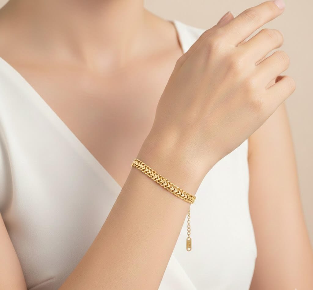 Ett sofistikerat armband med en tät, flätad kedjestruktur som ger en lyxig och fyllig känsla på handleden. Den högblanka finishen reflekterar ljuset vackert och gör det till ett perfekt val för både en stilren vardagslook och festligare tillfällen. Armbandet är helt vattentåligt och behåller sin spegelblanka lyster utan att missfärgas av fukt eller hudvård. En tidlös klassiker som är designad för att bäras varje dag med bibehållen kvalitet.
