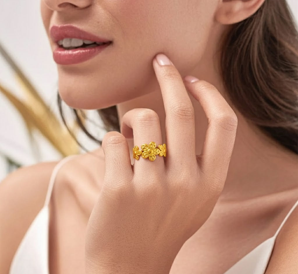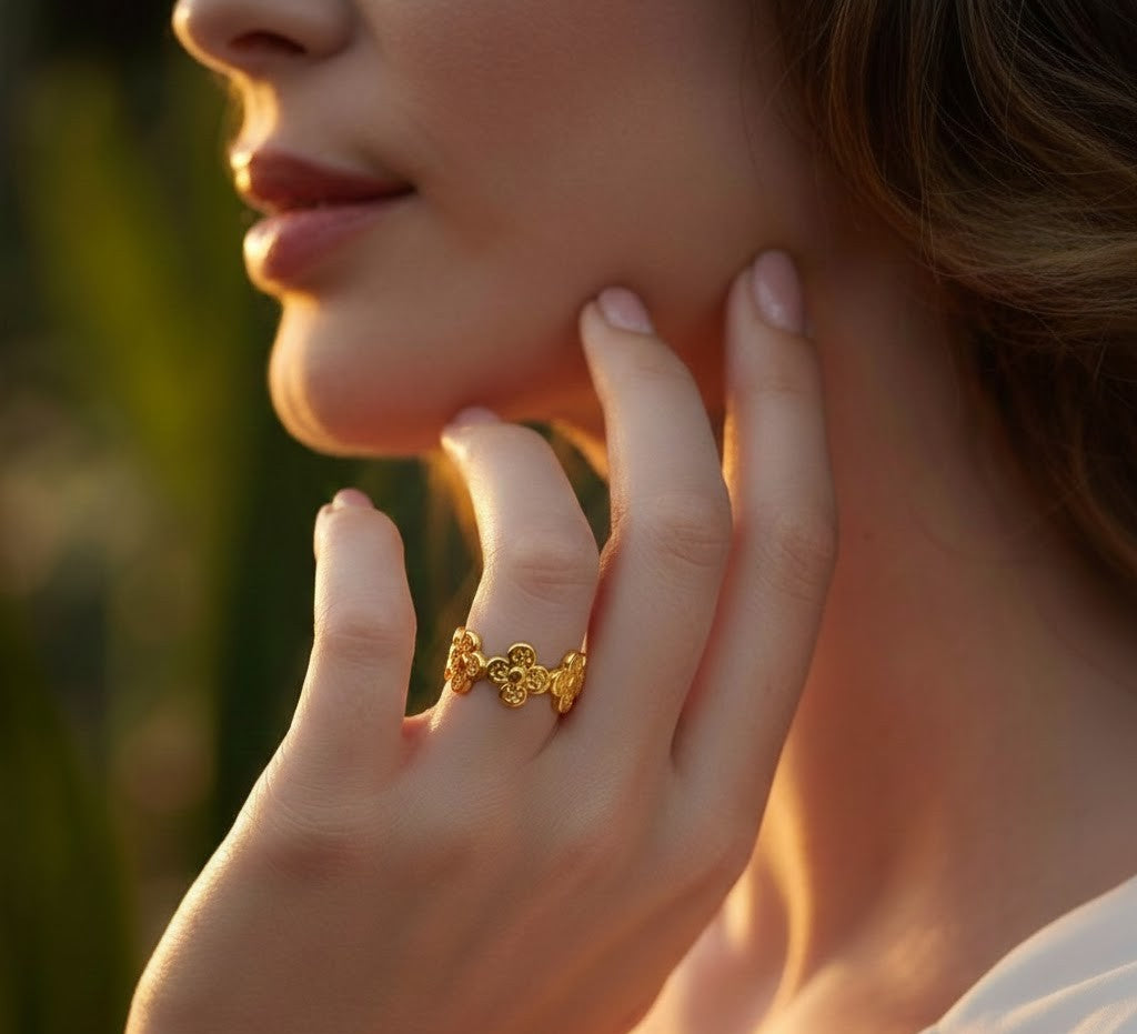 Flora Ring är inspirerad av blommornas mjuka form och ger din look en romantisk, feminin känsla. Den stilrena designen gör ringen lätt att bära varje dag, men med en detalj som känns lite extra – som en liten blommande touch på handen. Perfekt när du vill addera något sött, elegant och tidlöst.